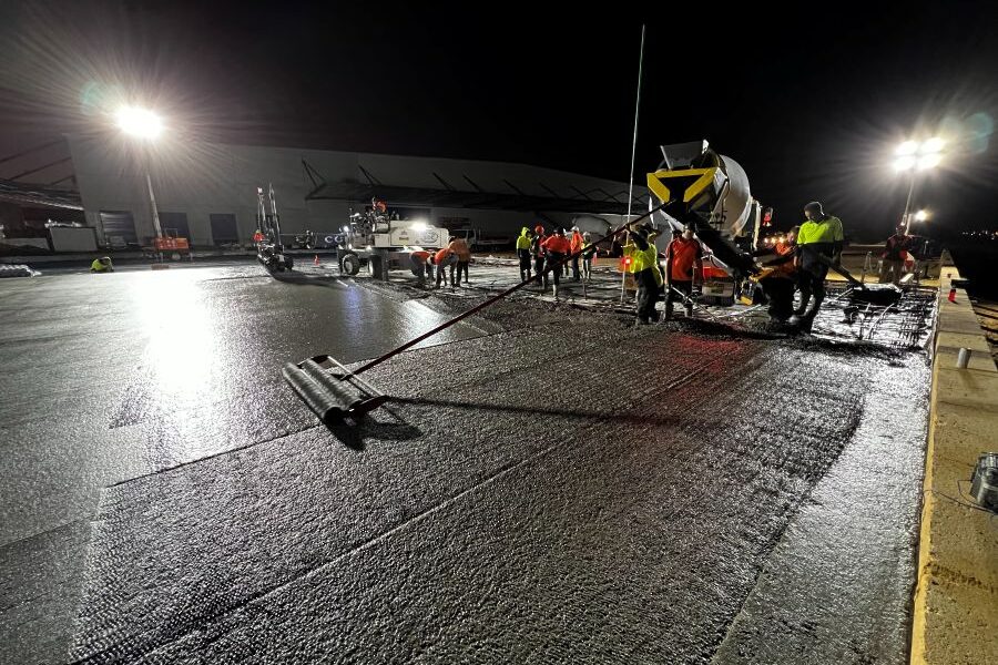 The project involved the construction of a 7,200 m² high-performance industrial slab designed to accommodate five-high stacked shipping containers and the movement of large container handling forklifts. These loading conditions required a structural solution that exceeded the performance of conventional jointed concrete pavements.
